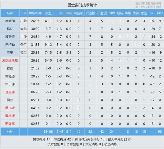 第四节打了一半,快船落后整整20分,泰伦卢换上替补阵容。今年夏天,快船用鲍威尔换来科林斯,又签下大洛佩斯、保罗和比尔,再次成为休赛期总冠军。常规赛开始后,快船又一次让人失望。全场结束,勇士98-79大胜快船。